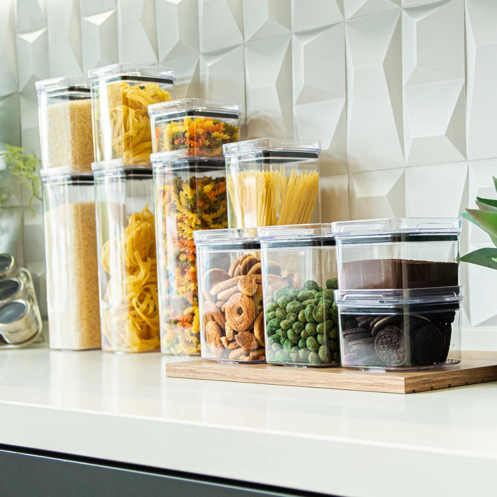 Sacos abertos e pacotes bagunçados ocupam espaço e atraem bichos. Transfira arroz, macarrão e lanches para potes herméticos, que empilham melhor e mantêm tudo fresco. Escolha modelos transparentes para ver o que tem sem abrir – praticidade total!