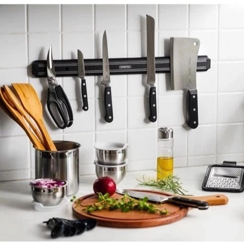 Espaço na bancada é ouro, então pendure o que puder! Ganchos ou barras magnéticas são perfeitos para facas, colheres ou até panelas pequenas. Instale um suporte na parede ou sob um armário e veja como sua cozinha ganha respiro – e estilo.